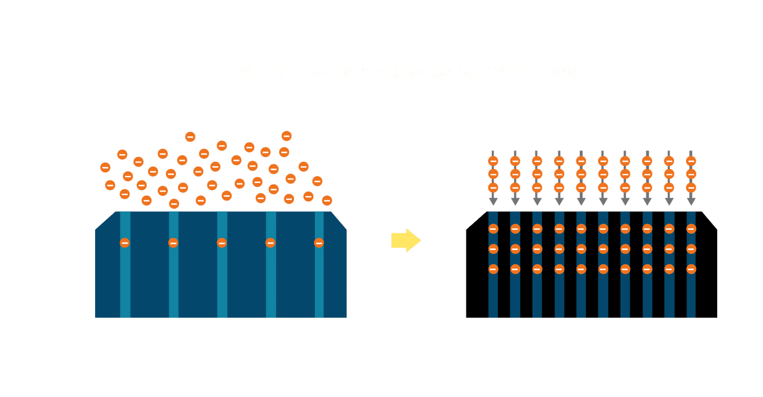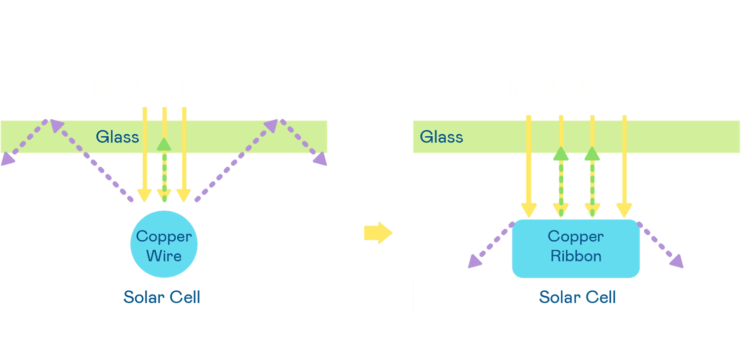 - 电池使用多条铜导线 (Copper wire) 于电池片上形成较短的电流路径,,,提高电流收集效率,,,,采用圆形设计的铜导线较传统扁平式的铜焊带 (Ribbon),,,,可增加入射至电池的光线量。。。。