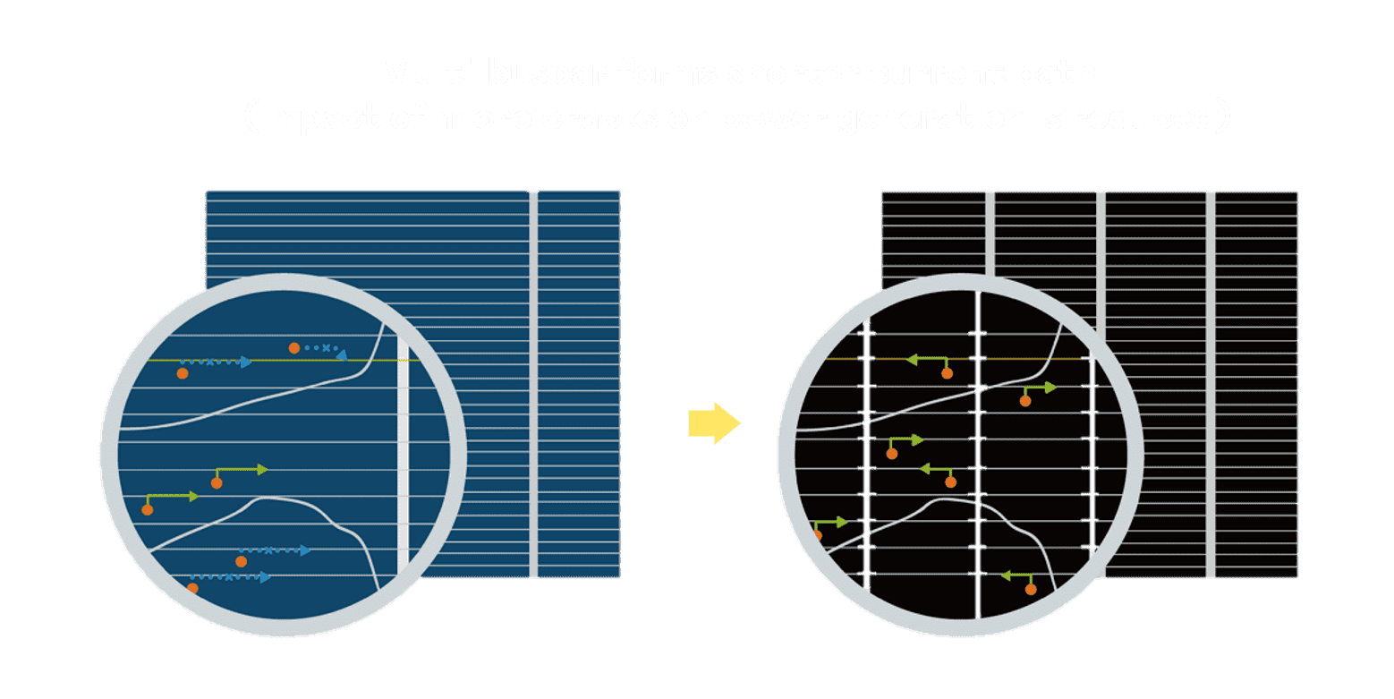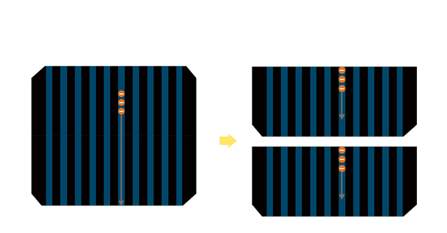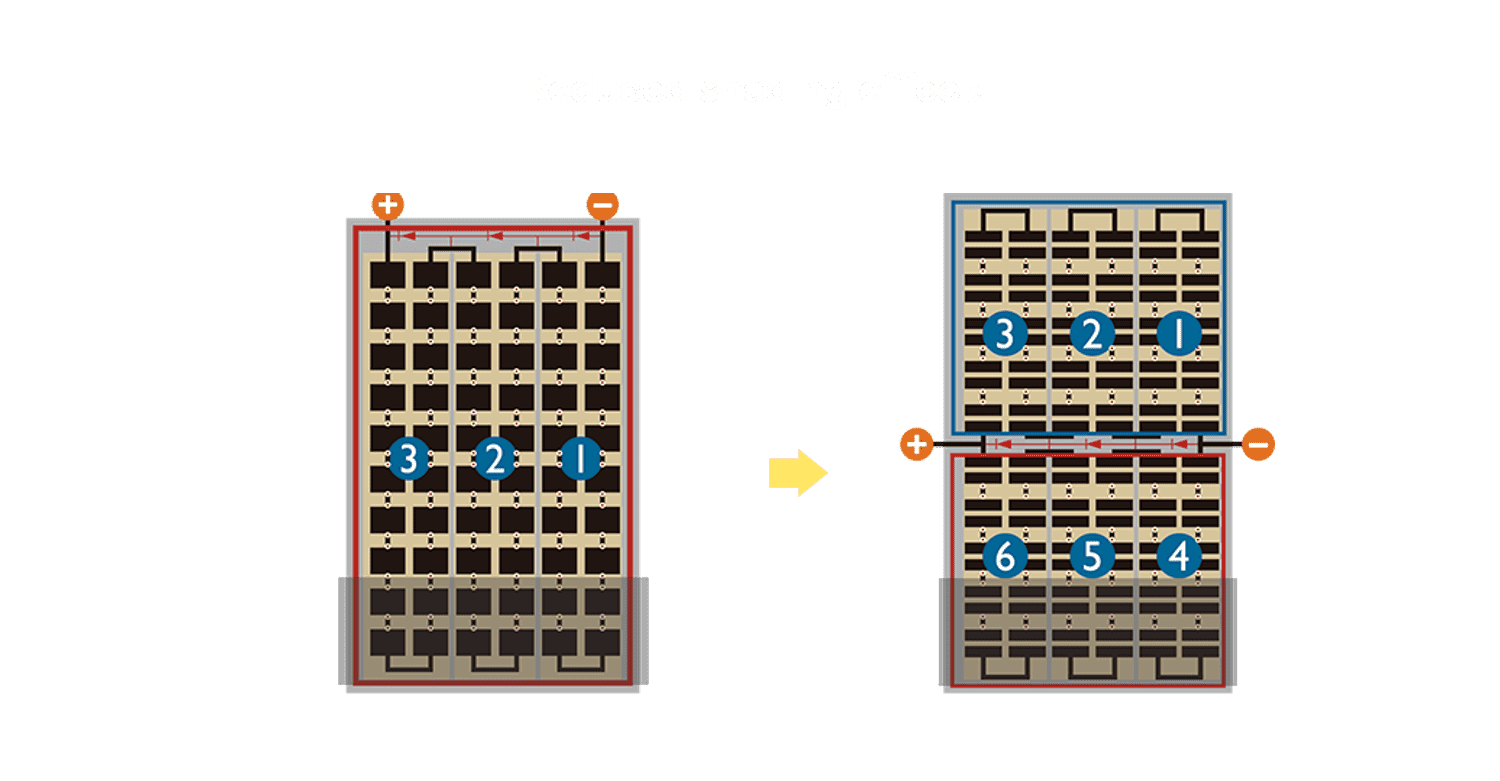 - 结合半切电池,,,降低遮阴影响、、、、提升模组抗隐裂能力、、并减少电阻损耗,,,进一步提升模组发电效能。。